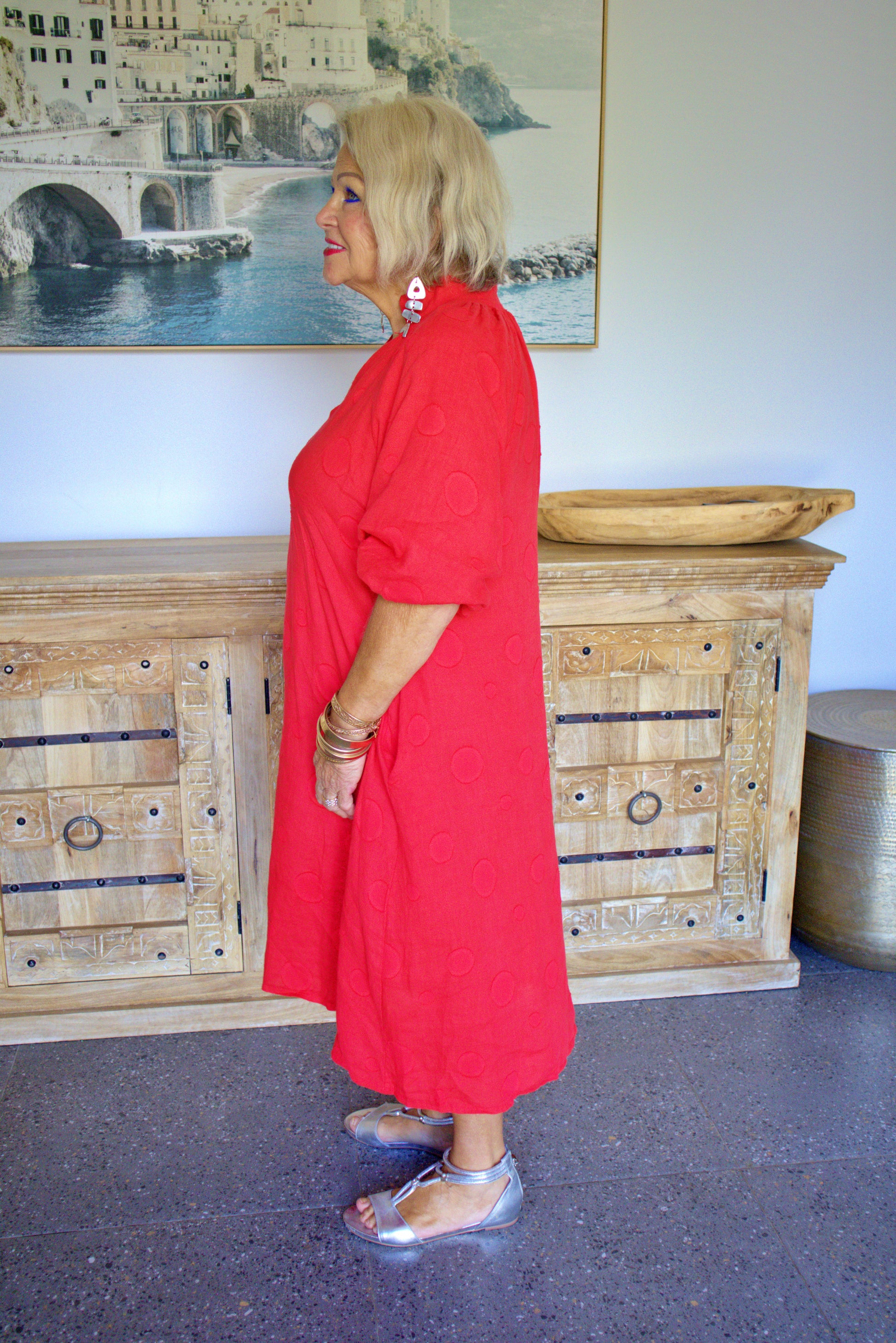 The answer to effortless summer dressing. Made from a stunning linen in tomato red fabric, this dress features a V-neck, long puff sleeves and A-Line skirt. This smock-style dress can easily be worn with sneakers or dressed up for a daytime event with heels and a mini bag.