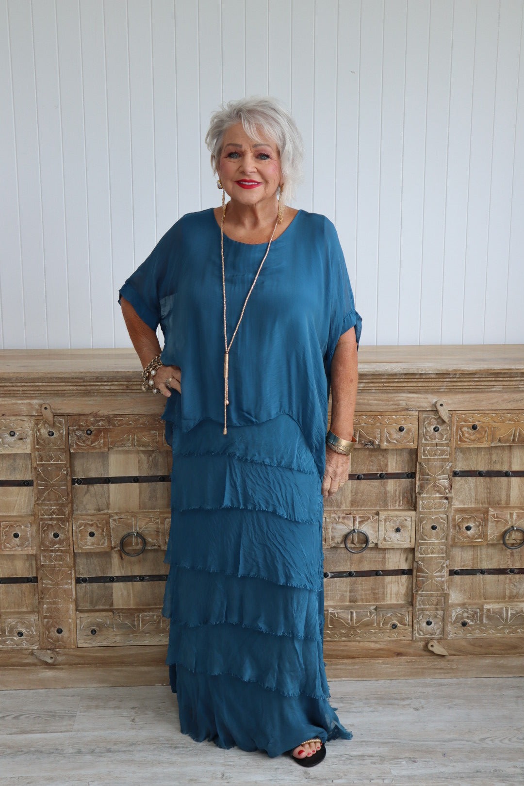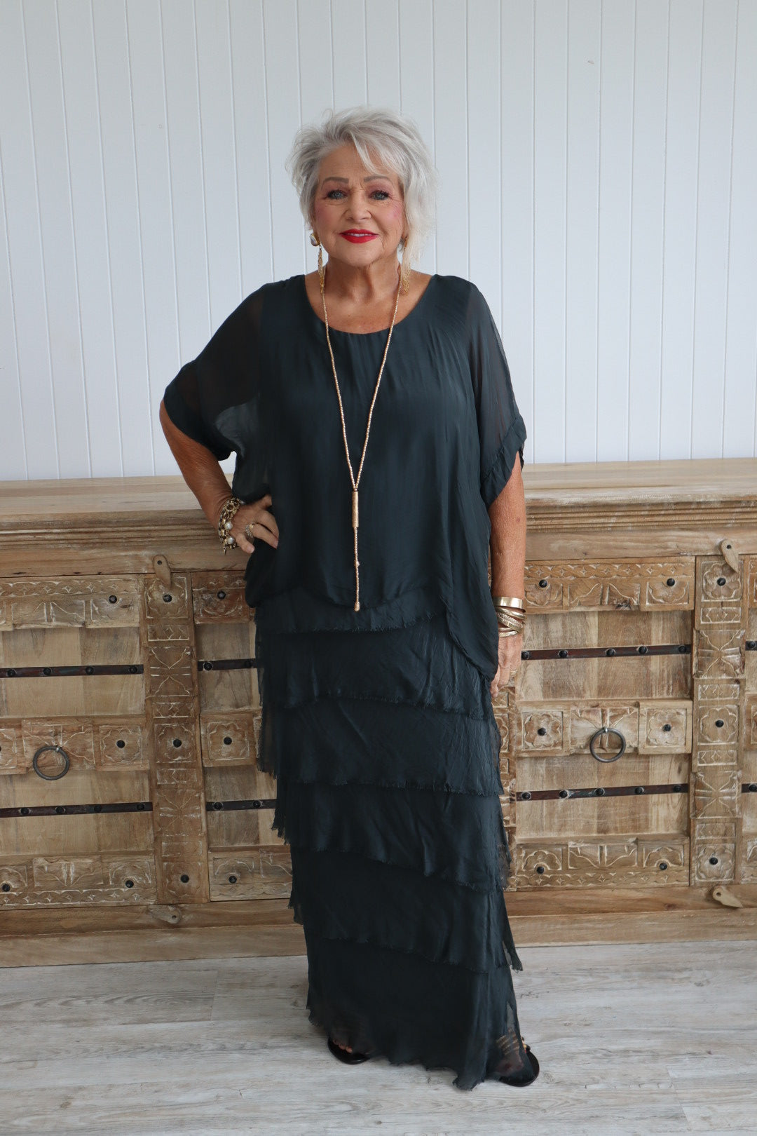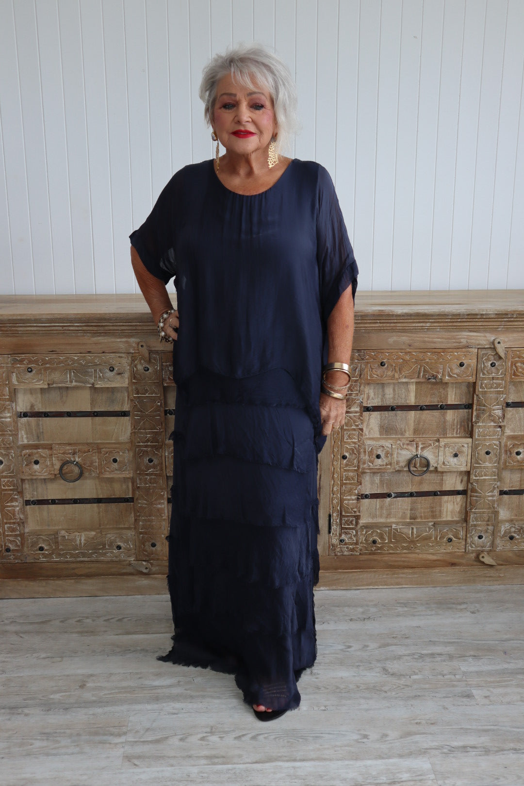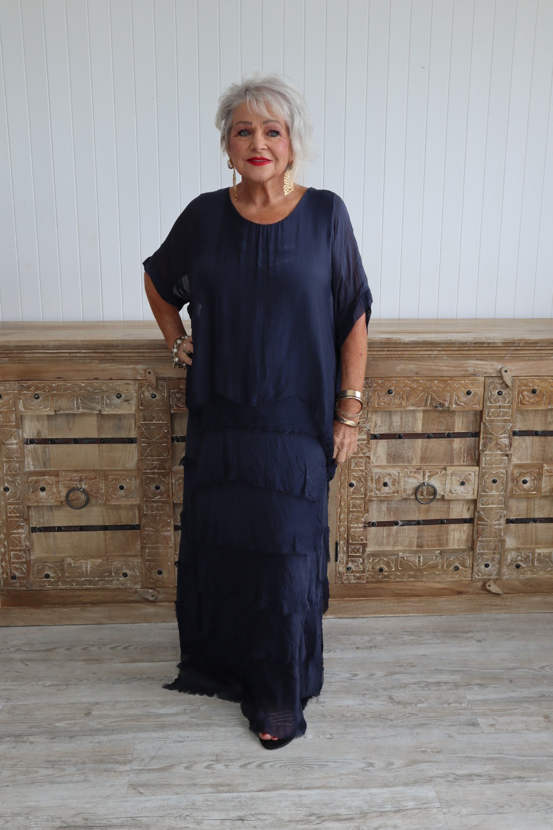 The 'Mother of the Bride' dress features a stunning 100% silk skirt that rests over an elasticated, supremely comfortable underskirt and top. The tiered silk construction is designed to flatter, ensuring that with its soft, flowing fabric, you'll move through the evening with elegance and style, as well as comfort.