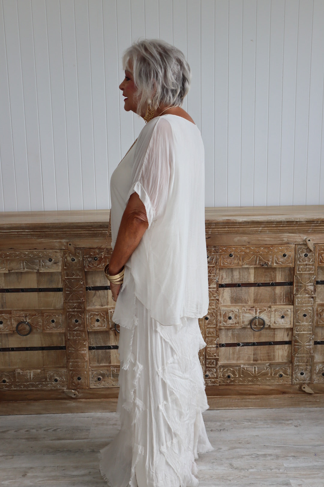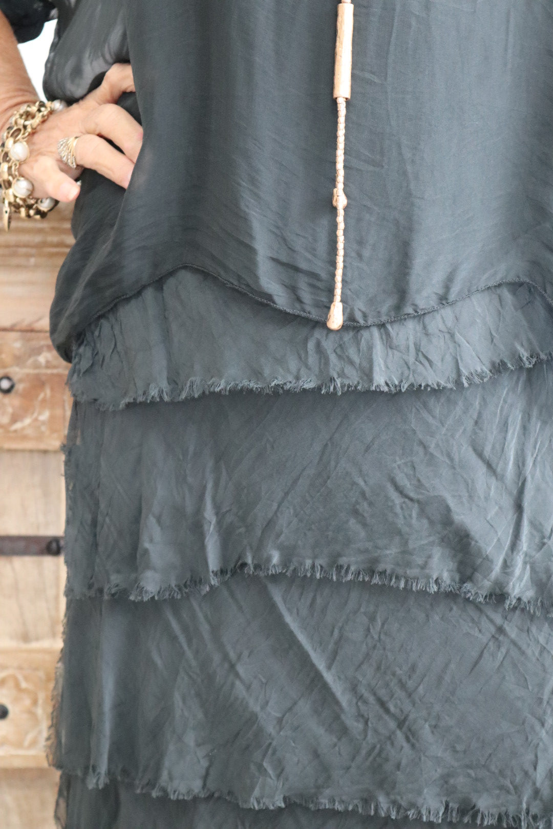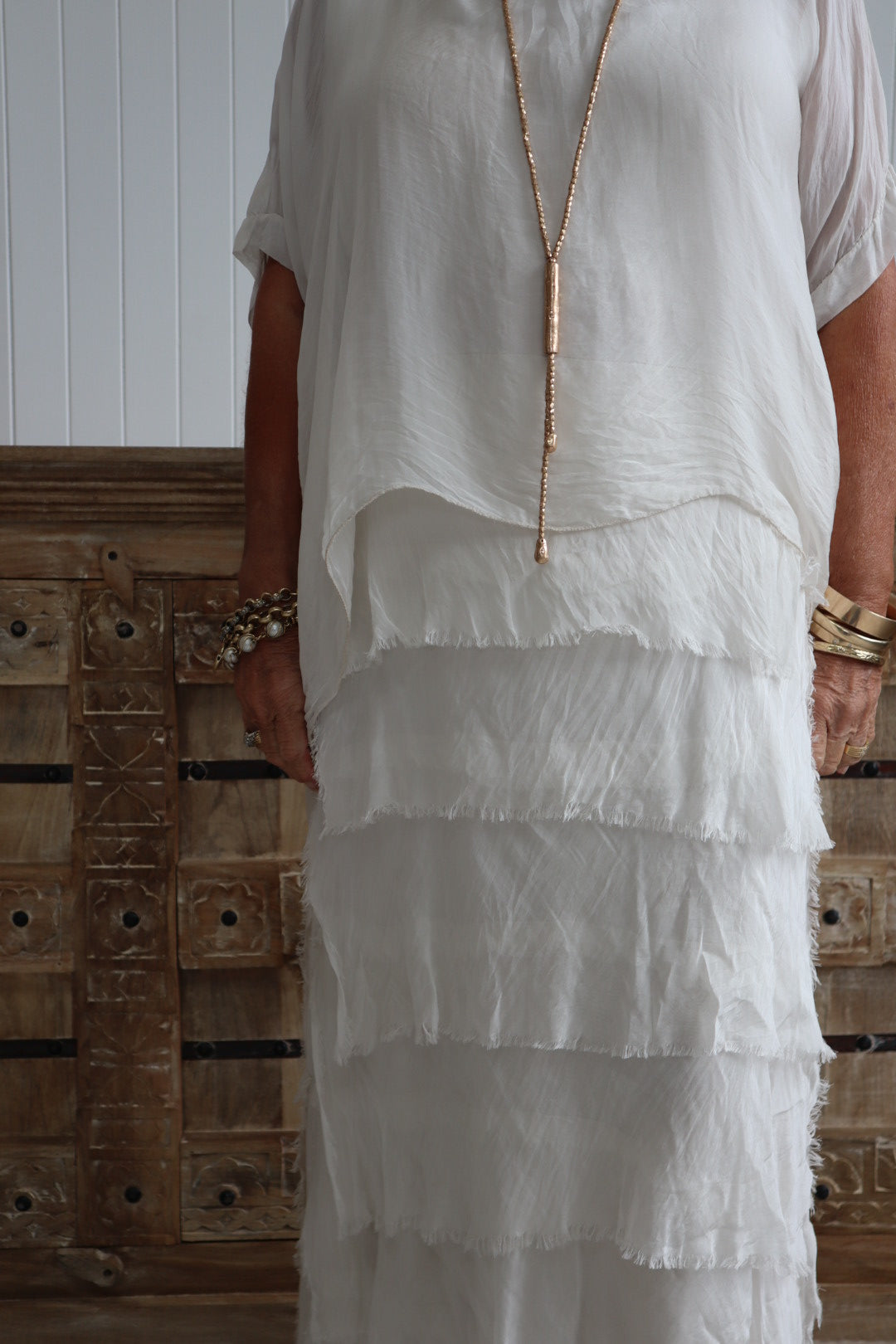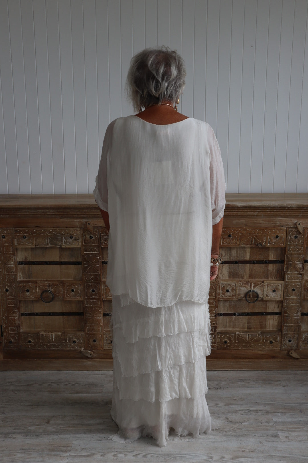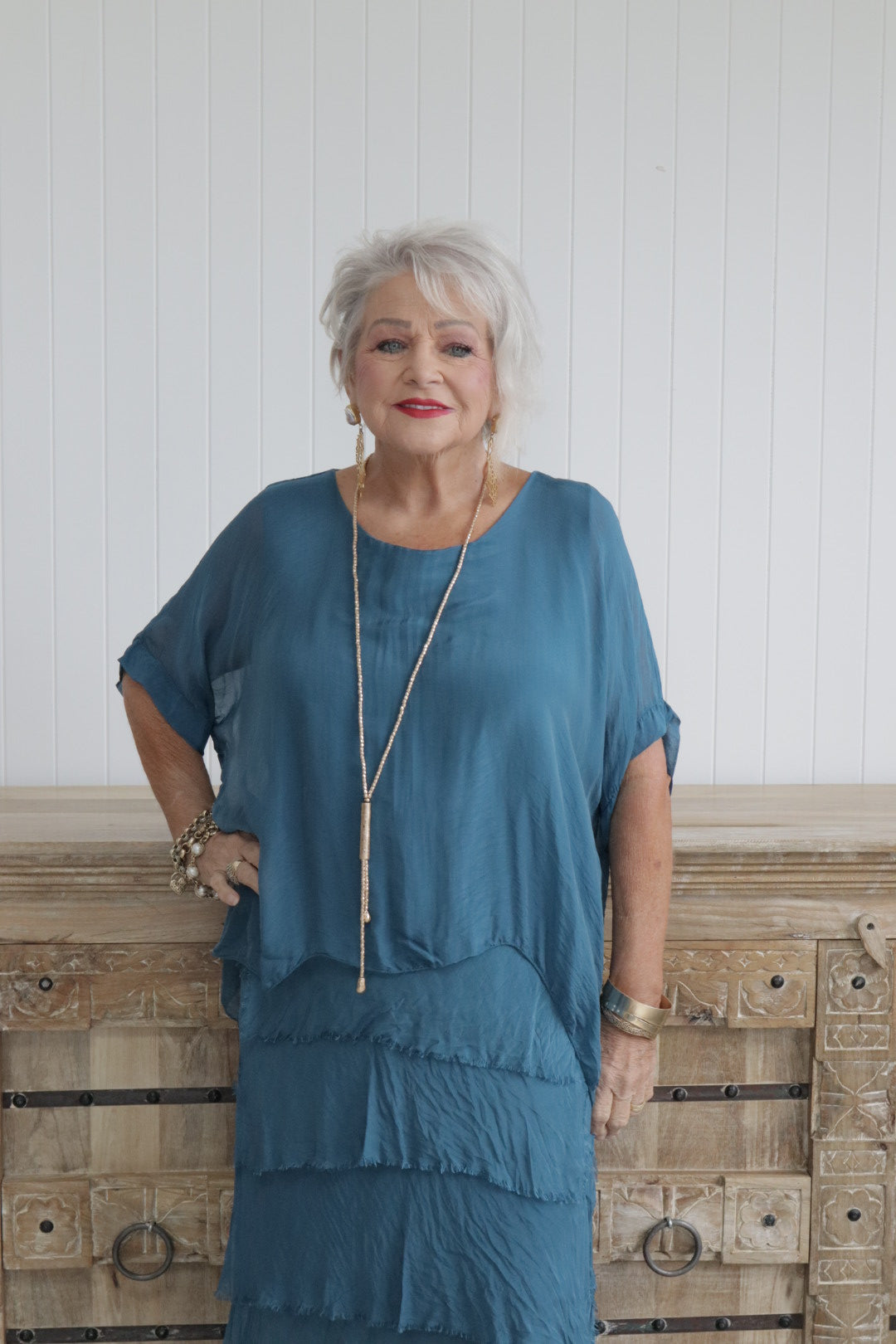 The 'Mother of the Bride' dress features a stunning 100% silk skirt that rests over an elasticated, supremely comfortable underskirt and top. The tiered silk construction is designed to flatter, ensuring that with its soft, flowing fabric, you'll move through the evening with elegance and style, as well as comfort.